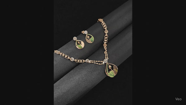 | An elegant 92.5 Sterling Silver creation with rose-gold finish, highlighted by artistic green enamel work. Perfect for festive wear, weddings, and graceful occasions. 👉 💎 Pure 925 silver craftsmanship 👉 🌹 Rose-gold polish with enamel detailing 👉 🌿 Unique nature-inspired design 👉 👗 Paired with matching earrings |