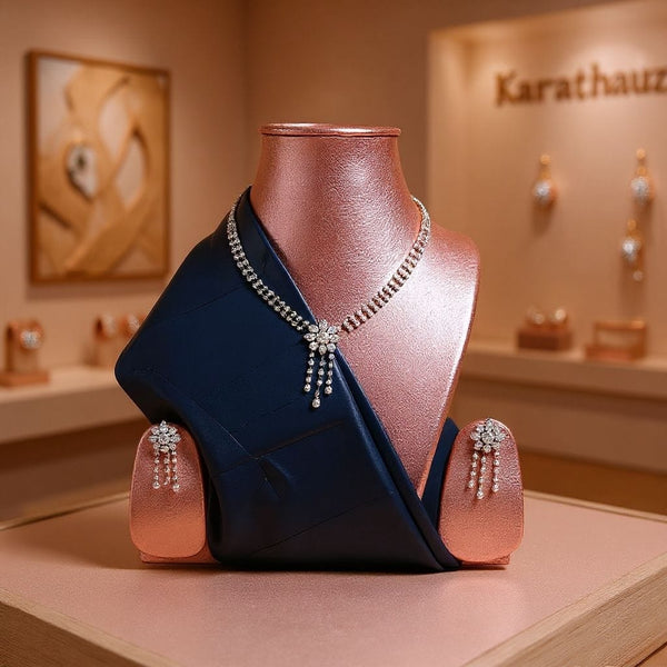 Turn every head in the room with this stunning artificial necklace and earring set, designed for the modern woman who loves to blend tradition with trend. This meticulously crafted set is adorned with high-quality Cubic Zirconia stones arranged in a delicate floral design, adding the perfect amount of sparkle to any outfit.