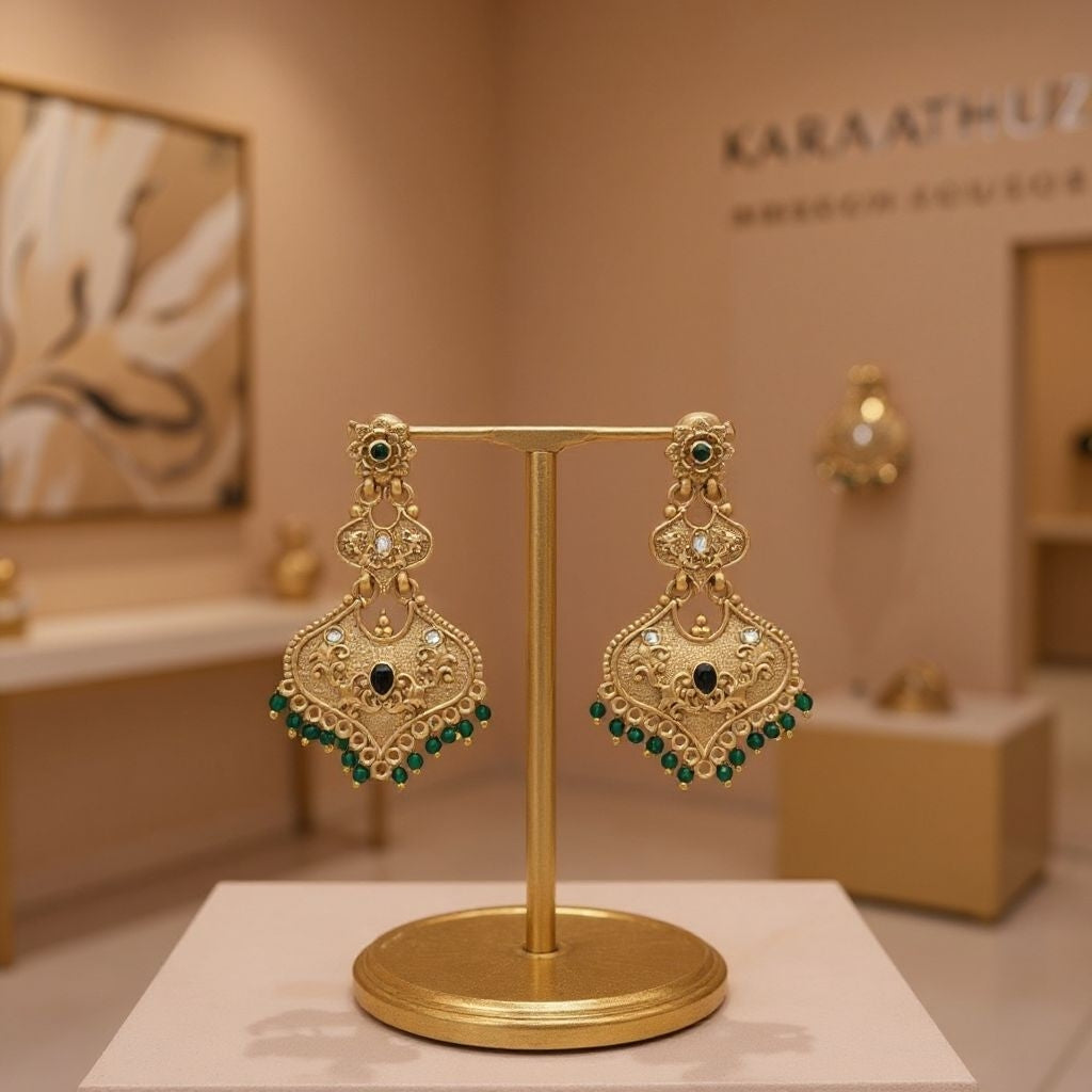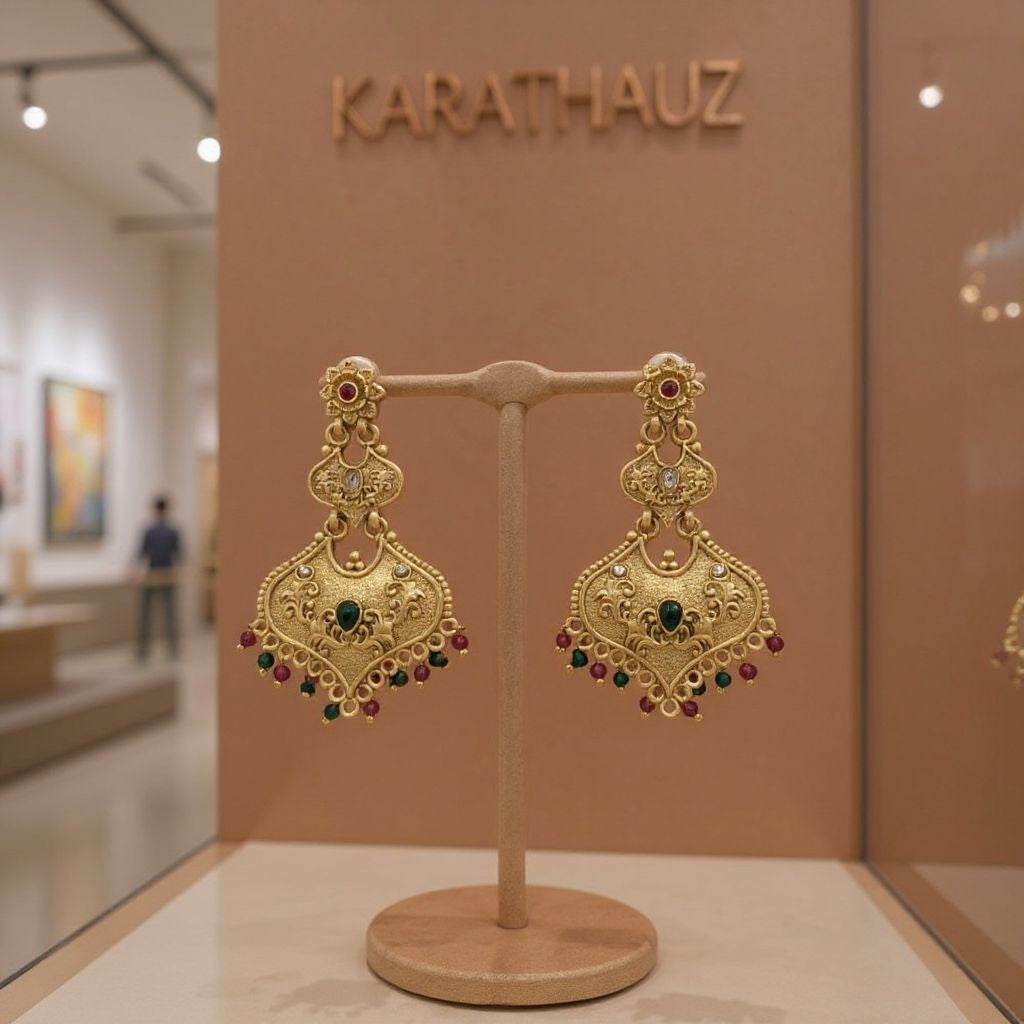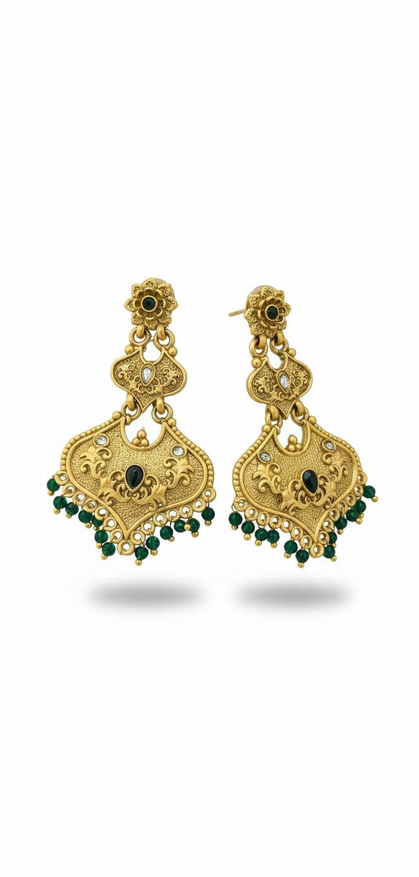 Elevate your ethnic charm with these exquisitely crafted Antique Gold Plated Jhumka Earrings, adorned with shimmering Kundan stones and delicate bead drops. Designed with intricate traditional motifs, these earrings add a royal touch to any festive or wedding ensemble. Lightweight yet luxurious, they're perfect for sarees, lehengas, and Anarkalis.